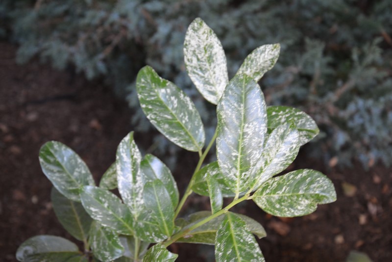 Ciekawa odmiana o ciemnozielonych, biało nakrapianych, błyszczących liściach. Przebarwienia są najlepiej widoczne wiosną, na nowych przyrostach, ale zimą (fot.09.02.2020) również ładnie się prezentują.