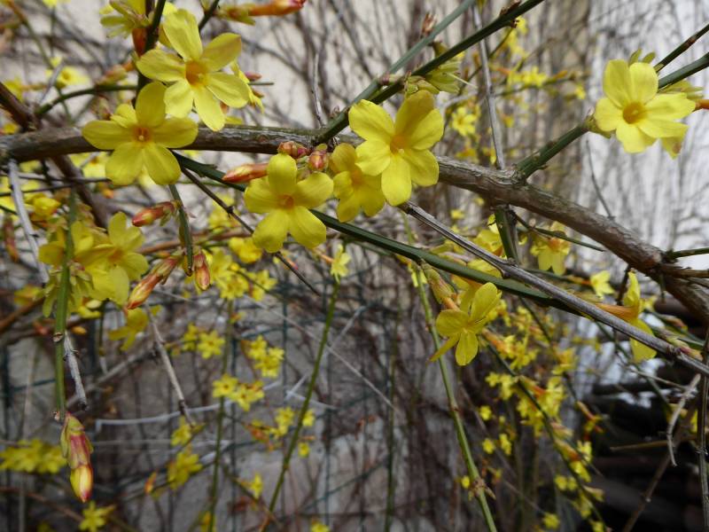 Kwiaty ma intensywnie żółte i pachnące; na pędach zeszłorocznych. Kwitnie nietypowo, bo nawet już w styczniu.