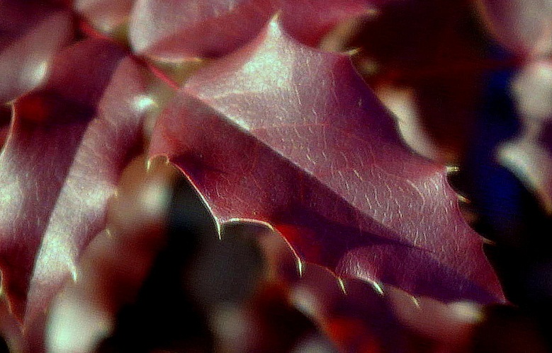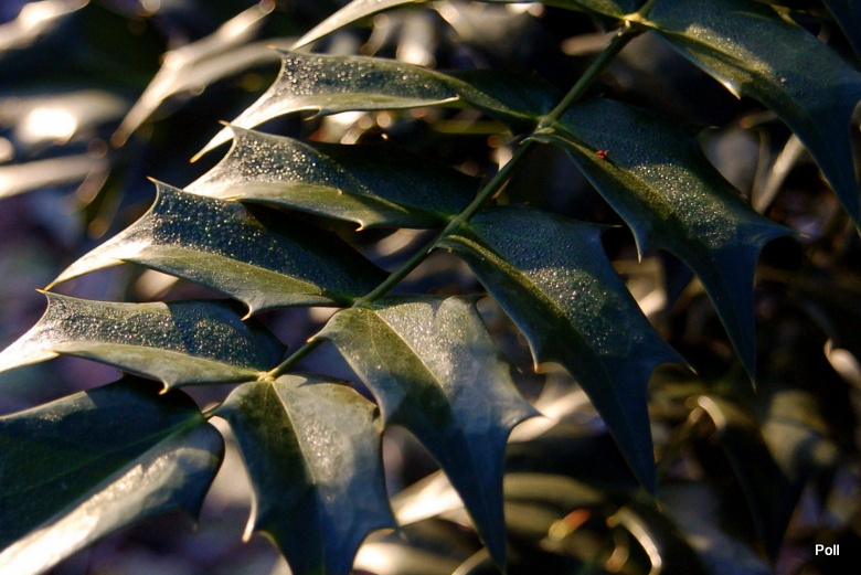 Liście: ciemnozielone, skórzaste, z ostrymi kolczastymi brzegami. W zimie zmieniają kolor na czerwonobrunatne.