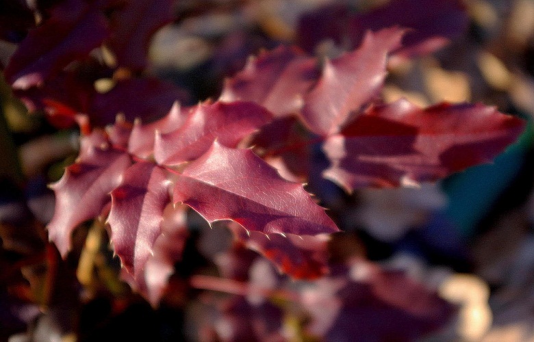 Kiedyś stwierdziłam, ze mahonia pospolita (Mahonia aquifolium), faktycznie jest dość pospolitym krzewem, który rzadko zwraca na siebie uwagę, gdy w zasięgu wzroku mamy kwitnące krzewuszki, czy rododendrony. Jednak jest taki moment, gdy to właśnie mahonie zachwycają i wcale nie jest to moment ich kwitnienia, choć jaskrawożółte kwiaty leciutko pachną miodem. Tym momentem jest zima, gdy mahonia -jak sporo innych zimozielonych roślin np epimedia, czy azalie japońskie - zmienia swoje wybarwienie. Dzieje sie tak, ponieważ wraz z obniżaniem się temperatur i skracaniem dnia, zanika produkcja chlorofilu, który odpowiada za zielony kolor liści. Rośliny przybierają więc barwy o rozmaitych odcieniach - od podbitego żółcią pomarańczu , przez róż i czerwień do brązów . Szczególnie efektownie wygląda to właśnie na błyszczących, mających ciekawą fakturę, liściach mahonii.