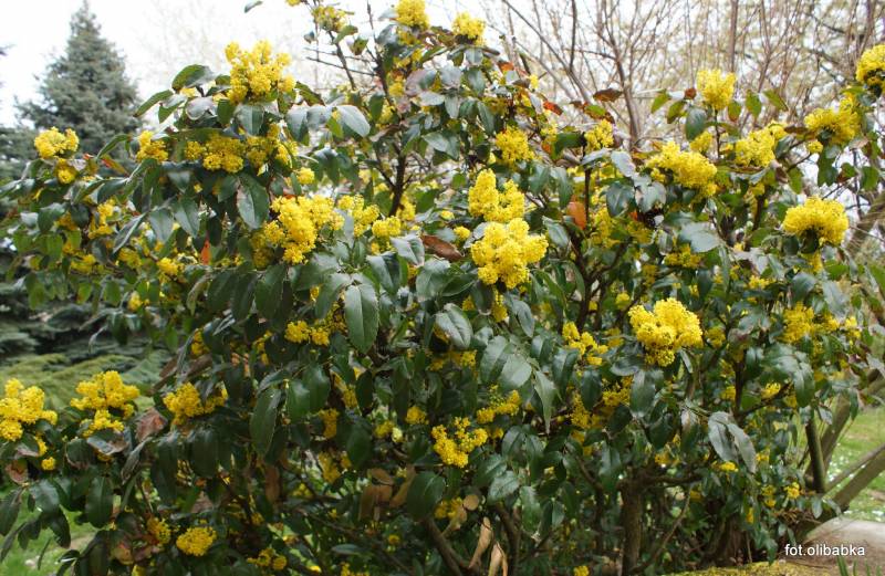 Kwitnie mahonia pospolita Apollo - odmiana bardziej zwarta, niższa, o większych kwiatach (Award of Garden Merit 2002)