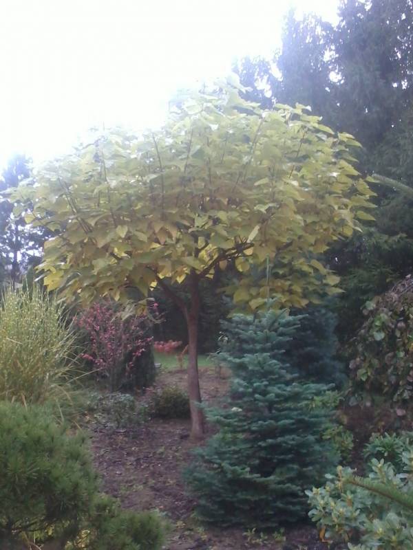 Katalpę bignoniową miałam od wielu lat , wiele razy złamana była i podmrożona . W tym roku została ścięta , bo korniki się już za nią zabrały , ale mam jeszcze dwie takie uformowane na drzewka i co roku przycinane . To dwie pierwsze . Trzecia to Aurea , bardzo ładna ,korona rośnie wolno , ale pień przyrasta szybko . Czwarta to chyba Ovata , czyli żółtokwiatowa .