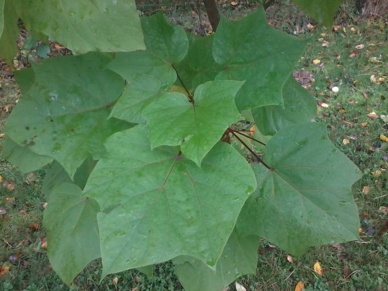 Liście: bardzo duże, ozdobne sercowate. Opadają po pierwszych przymrozkach. Jeśli jesień jest ciepła, przebarwiają się na żółto.