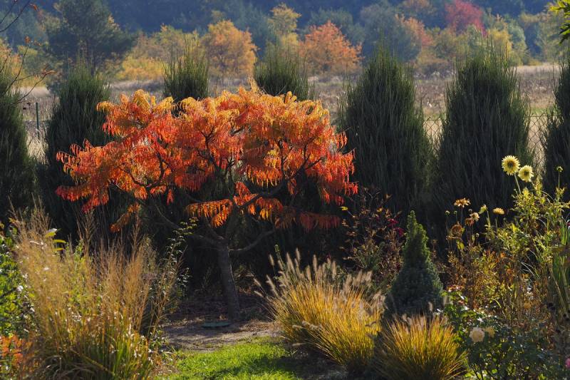 Rhus typhina, spotkać możemy w ogrodach sumaki odmianowe, różniące się kształtem i kolorem liści: