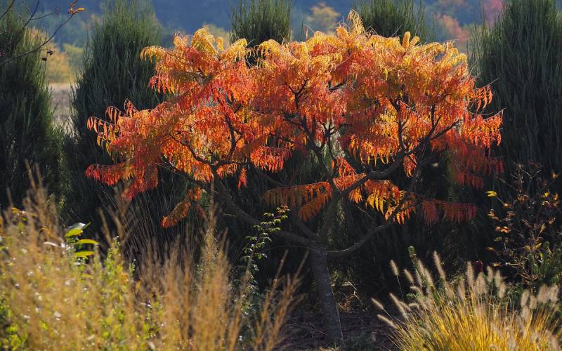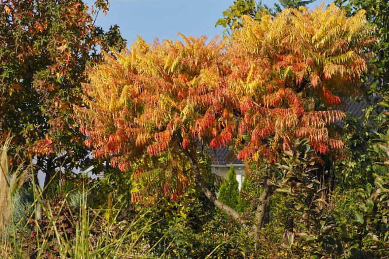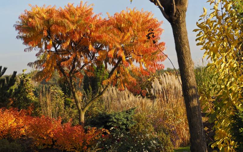 Prócz pospolitego gatunku Rhus typhina, spotkać możemy w ogrodach sumaki odmianowe, różniące się kształtem i kolorem liści: