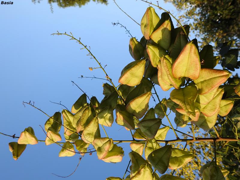 Następnie roślina wytwarza dekoracyjne owoce w formie rozdętych torebek, które zmieniają kolor od zielonego przez brązowo różowy, aż do czerwonego i pomarańczu. Zielone, pojedynczo pierzaste liście, jesienią przebarwiają się na żółto i pomarańczowo-czerwono, co w połączeniu z kolorowym kwiatostanem daje spektakularny efekt :)