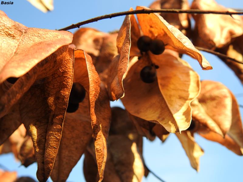 Jesienią liście przebarwiają się na żółto-pomarańczowo. Roślina kwitnie w długim odstępie czasu, w związku z tym część owoców już dojrzała i opadła, a niektóre jeszcze zdobią drzewko :)