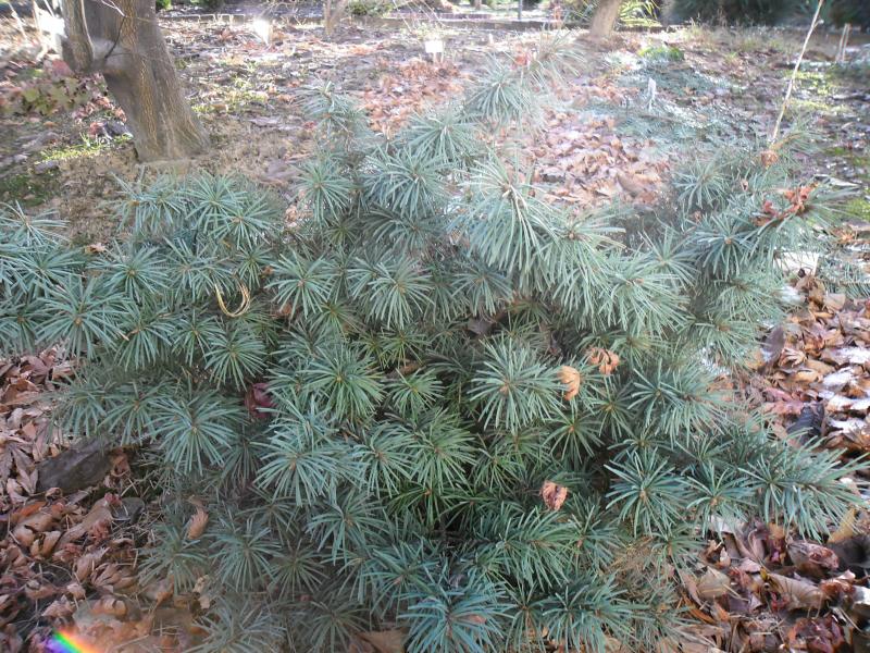 Karłowa, wolno przyrastająca odmiana o kulistym pokroju i zielono-srebrnych igłach.