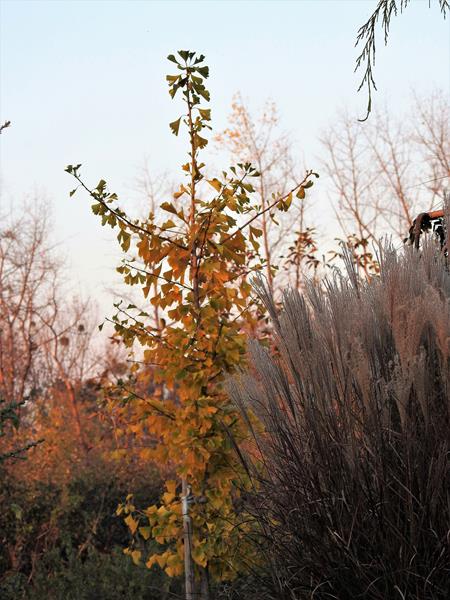 Liście: wachlarzowate, osadzone na długim ogonku, szerokości 5–8 cm., jasnozielone w nieregularne kremowe paski, jesienią przebarwiają się na żółto.