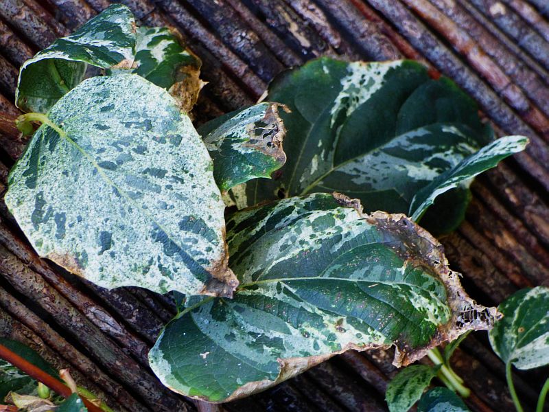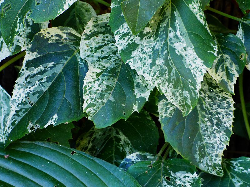 Liście dekoracyjne o licznych i drobnych, biało - zielonych plamkach układających się w nieregularną mozaikę... sercowate, szerokie u nasady i zaostrzone na końcu... grubo ząbkowane