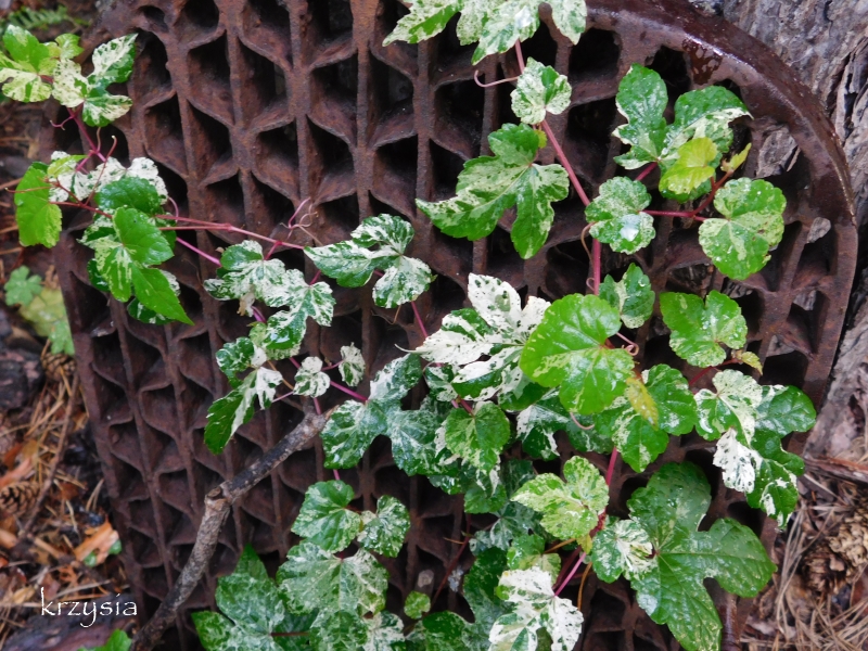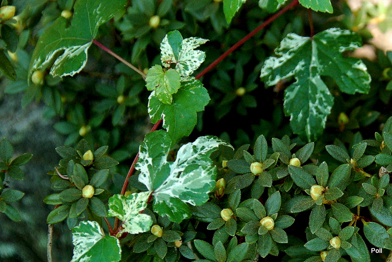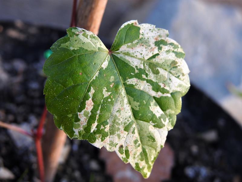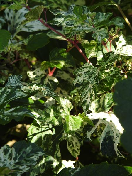 Liście: trójpalczaste, pokryte zielono-różowo-białym marmurkiem