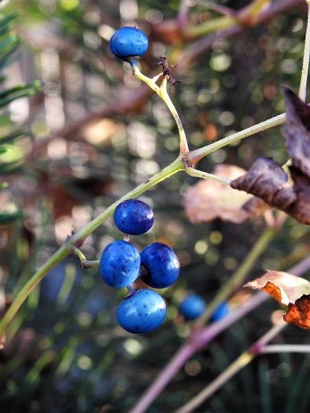 Owoce:okrągłe, fioletowe i niebieskie jagody z kilkoma nasionami w środku