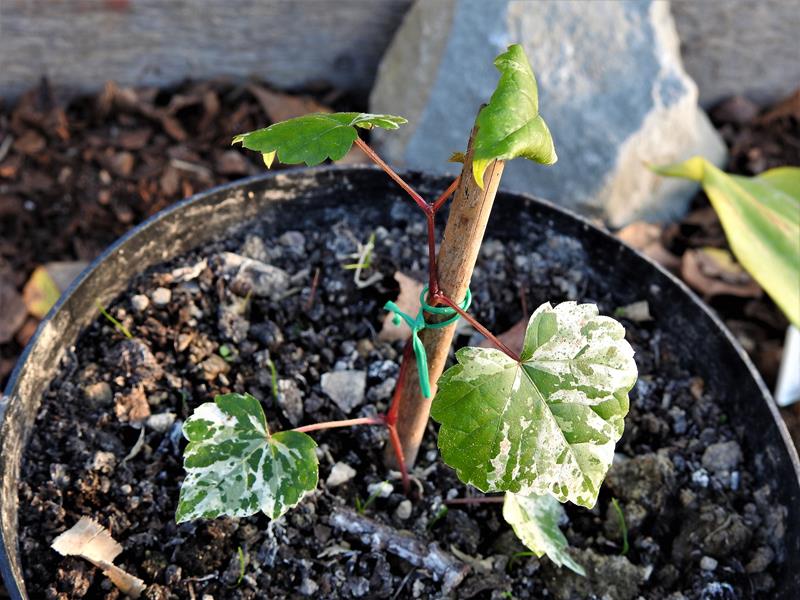 Liście: trójpalczaste, pokryte zielono-różowo-białym marmurkiem