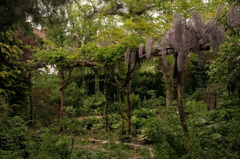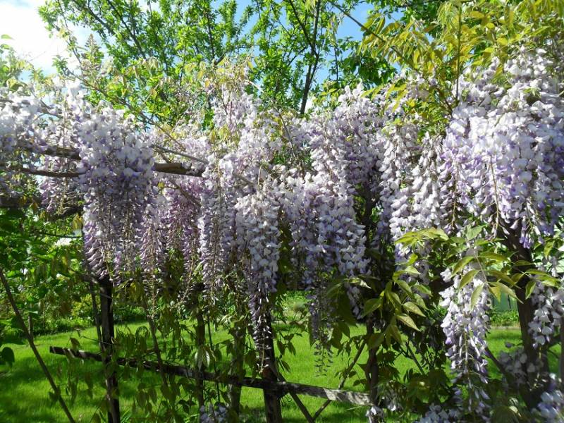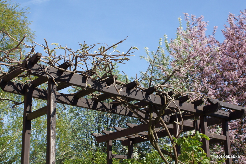 Teraz mam jej trzy egzemplarze- jeden przy domu i dwa w Jedrzejówce. Ponieważ to mocarne pnącze, wspiera się i owija wokół drewnianego stelaża, tworzącego tunel. Obie rośliny w Jedrzejówce zazwyczaj nie kwitły - późne wiosenne przymrozki ważyły pąki. Później, po wypuszczeniu liści wysilały się na wydanie kilku kwiatów, ale efektu wodospadu fioletowych gron nigdy nie widziałam. W tym roku, owszem. Pierwszy raz od 8 lat! hu_rra