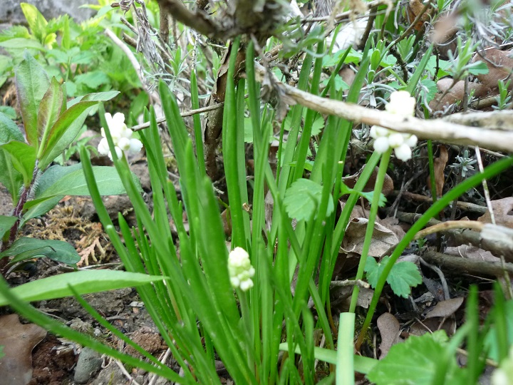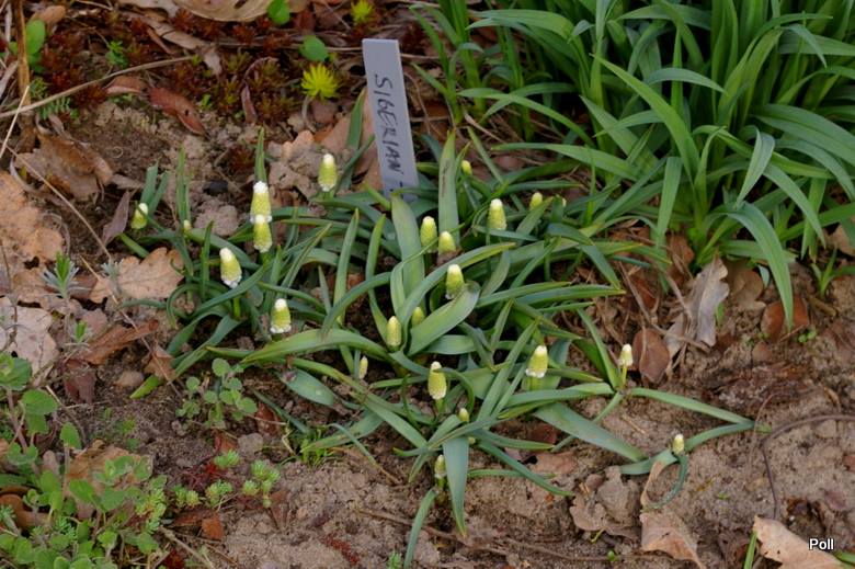 Szafirek o białych kwiatach- Siberian Tiger. Rosnie na słonecznym stanowisku, koło innych szafirków a jego kwiaty dopiero się pokazują