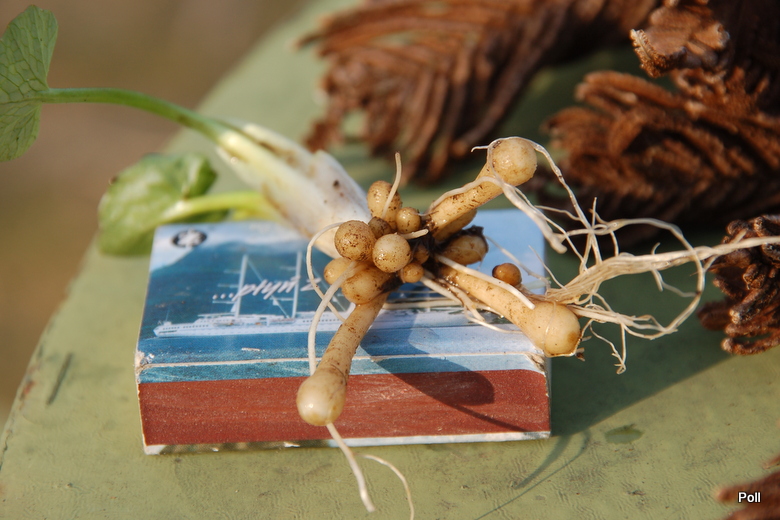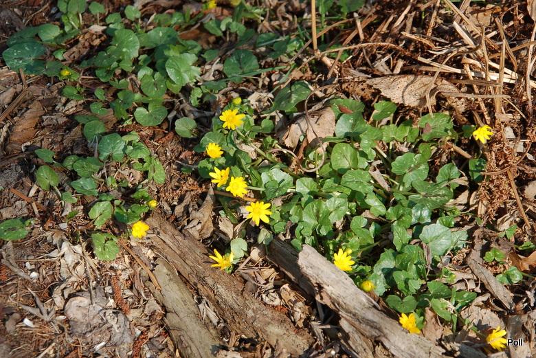 Ficaria verna 'Collarette' o żółtych, pełnych kwiatach, rośnie pod hostą, w często podlewanym miejscu. Wiosną ma dośc słońca, które bardzo lubi i które zapewnia mu obfite kwitnienie.