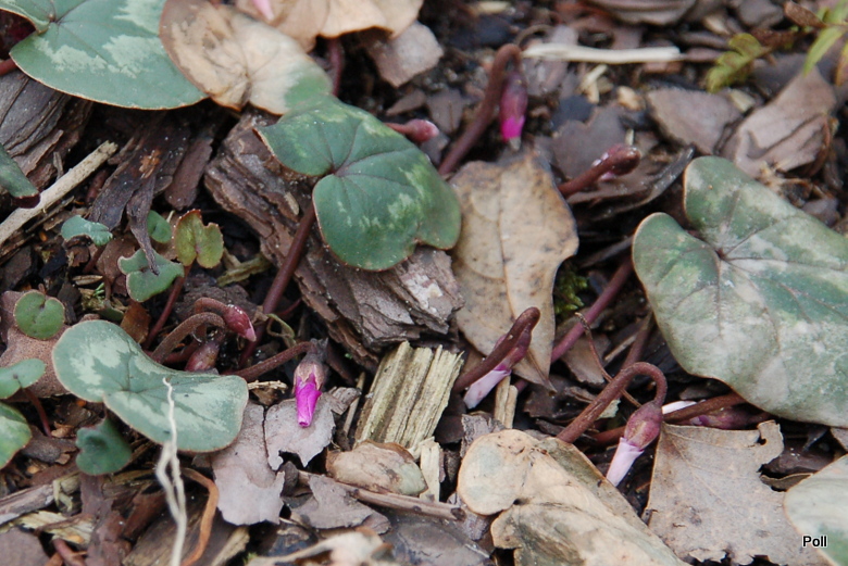 Kwitną, nie jakoś specjalnie ale dają radę. Powoli pojawiają się liście. Ponoć pochodzi z Kaukazu ale zwyczajowa nazwa tej rośliny to cyklamen neapolitański. Gleba dla niego przepuszczalna, niby zasadowa zalecana ale u mnie rośnie bezczelnie w próchniczej, od czasu do czasu daję dolomitu żeby "kwachy" uspokoić. Rośnie sobie pod drzewami. Chyba mu dobrze bo się rozsiewa. Teraz przyjdzie czas na urodne liście, które będą zdobiły jego stanowiska przez całą zimę. Wiosną zanikną a przyszłą jesienią znów pokażą się kwiaty.