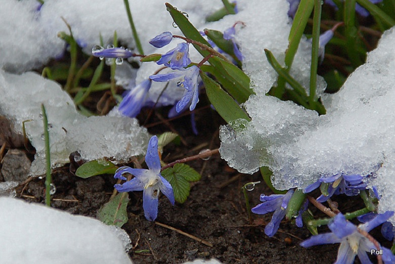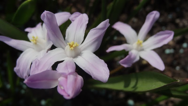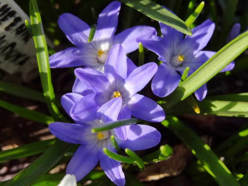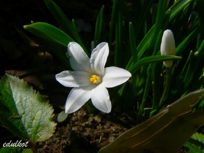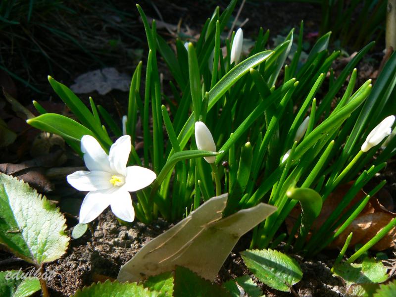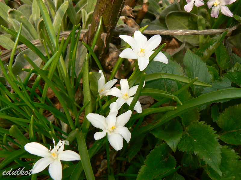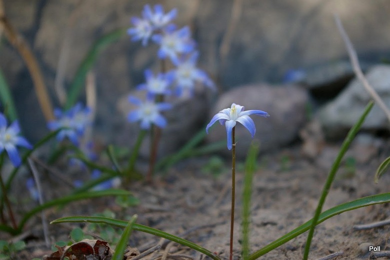 Chionodoxa sardensis); do 22 kwiatków na łodyżce, koloru akwamaryny (gencjanowo-niebieski) z bardzo malutkim białym oczkiem.