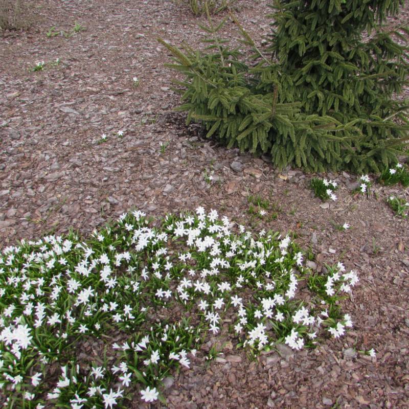Rosnący obok Śnieżnik Forbesa (Chionodoxa forbesii) Alba jest bardzo lichy.