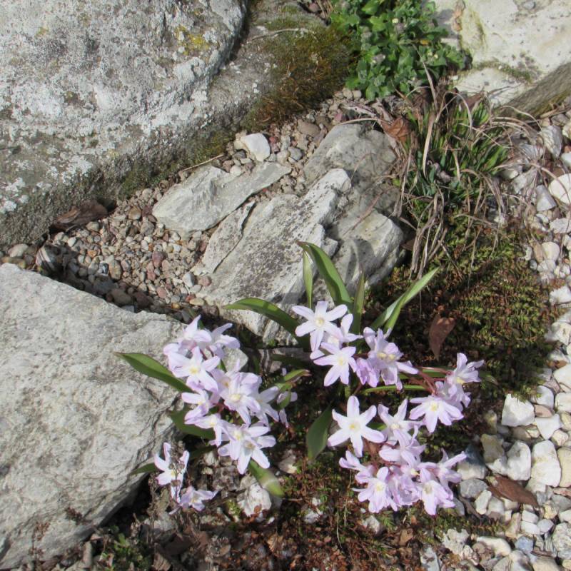 Śnieżnik Forbesa (Chionodoxa forbesii) Pink Giant jeszcze ładnie kwitnie bo rośnie w większym cieniu.