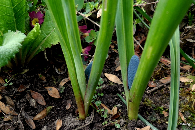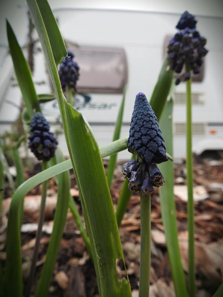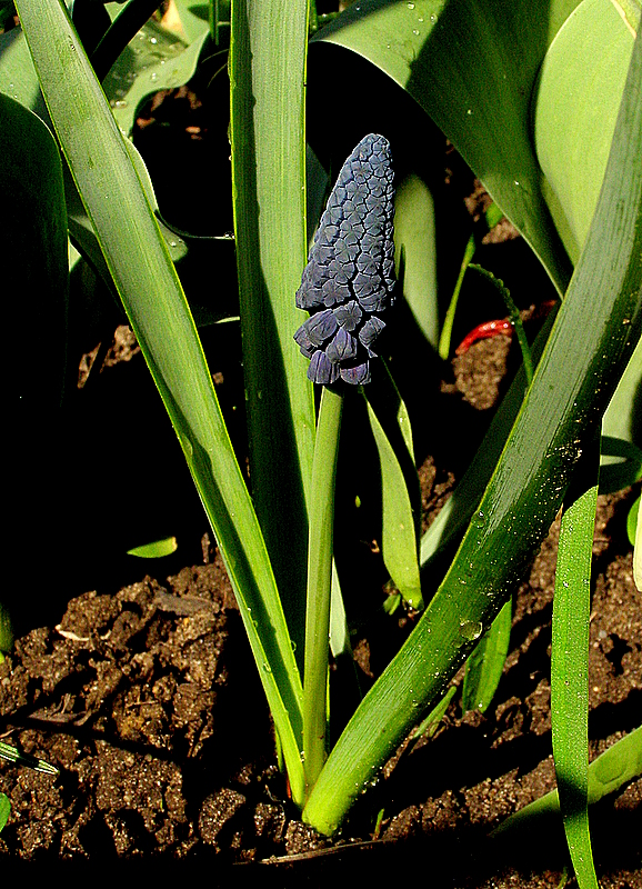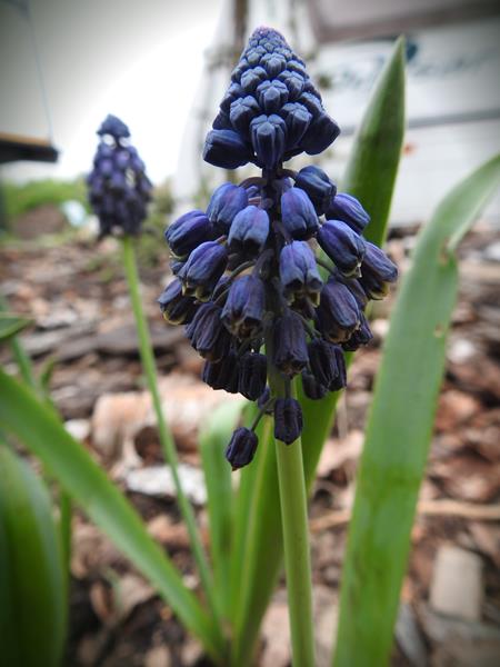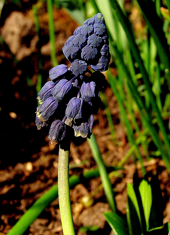 Kwitnie: IV - V. Kwiaty dzwonkowate czarno-granatowe z jaśniejszymi, zielonkawymi brzegami. Kwiatostan przypominający szafirki.