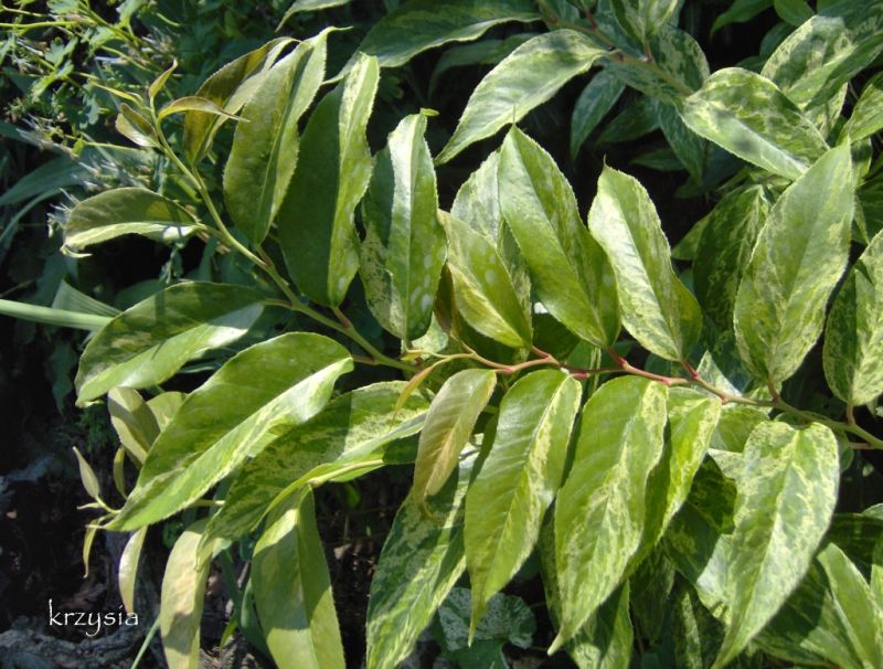 "Odmiana zasługuje na szczególną uwagę. Jest to bowiem zimozielony, niski, dobrze zagęszczający się krzew o wielobarwnych, marmurkowato-pstrych, lancetowatych liściach, utrzymujących przebarwienie przez cały rok. Wiosną przebarwienia mają kolor kremowo-pomarańczowy, latem pojawia się barwa czerwono-różowa, a jesienią przeważają odcienie bordo. Kwiaty pojawiają się w maju, są białe, drobne, dzwoneczkowate, zebrane w grona."
