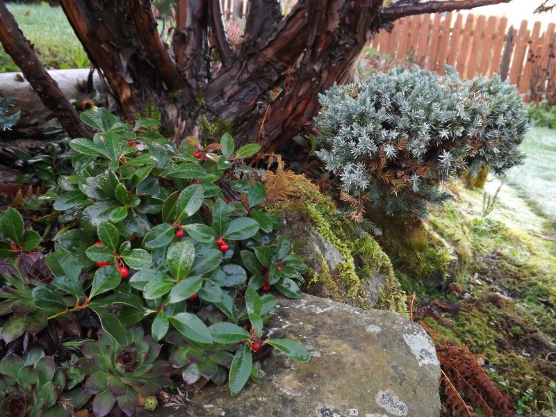 U mnie gaulteria rozesłana rośnie w półcieniu, w naturalnej, kwaśnej glebie. Wiosną - jak wiele zimozielonych roślin - cierpi nieco od palącego słońca wespół z przymrozkami.
