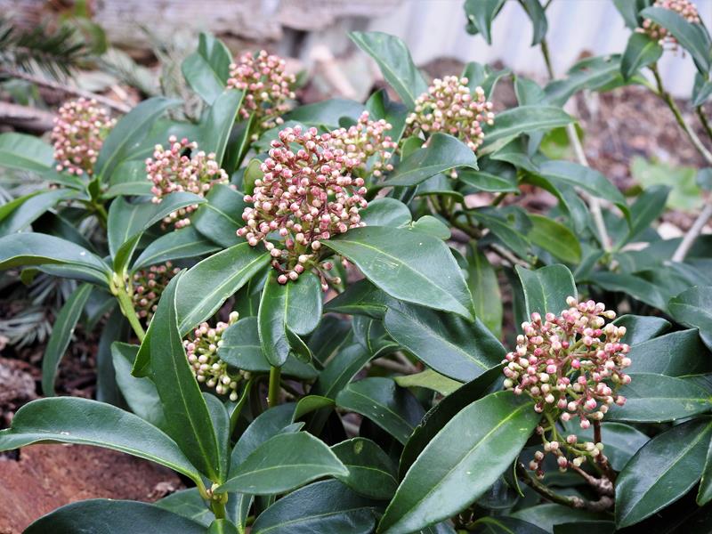 Skimia japońska 'Godries Dwarf' cała w pąkach kwiatowych clap