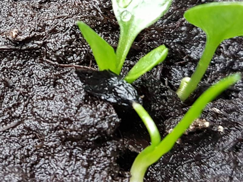 Czarne nasionko a z niego wychodzi drobny hościk hosty.