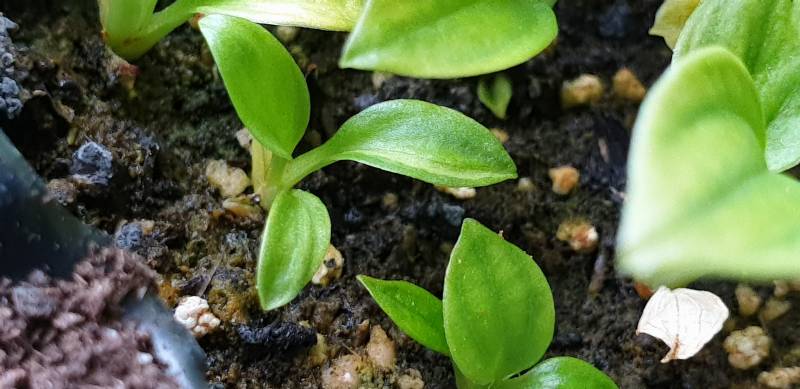 Grzegorzu , siewki są tak zmienne ,że po pierwszym drugim , czy trzecim liściu jeszcze za wiele nie można powiedzieć , jaka będzie . Pierwsze listki przeważnie są zaokrąglone . Na poniższym przykładzie widać ,jak wyglądały pierwsze liście ,a jakie urosły później . Ta siewka , też miała pasemko na jednym liściu , a teraz jak podrosła , to tylko jeden listek ma przebarwienie , a jeszcze jakie wydłużone liście wyrosły .