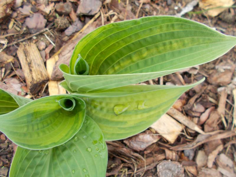 Moja Whirlwind była już dużą kępą i została prawie doszczętnie zjedzona przez nornicę. Został niewielki kawałek kłącza, hosta zaczęła się regenerować... i oprócz zwykłych liści wypuściła coś takiego... :mniam