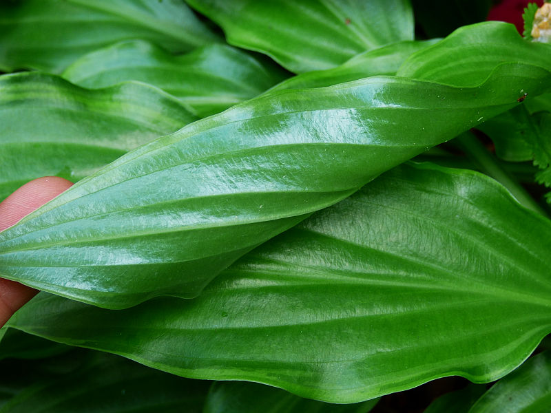 Listki ma długie i delikatnie falujące oraz błyszczące w kolorystyce powiedzmy, że pośredniej zieleni z cieniutkim jasnozielonym marginesem