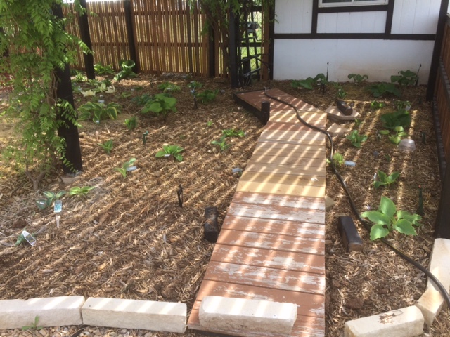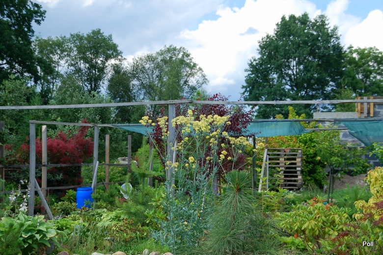 Jestem jednak wielbicielką i kolekcjonerem host i dobrze rozumiem pożądliwość serca kolekcjonera. Moja działka 12 lat temu była słoneczna patelnią bez jednego drzewa a ja chciałam uprawiać rośliny cienia!!! Jeśli się chce, można i brak naturalnego cienia pokonać. Sadziłam drzewa, aby się tego cienia w przyszłości dochować a tymczasem zastosowałam sztuczne cieniówki zawieszone na drewnianych stelażach. Takie konstrukcje wytrzymują zazwyczaj 5-6 lat i choć nie wygladają elegancko, pozwalają roślinom na prawidłowy rozwój.