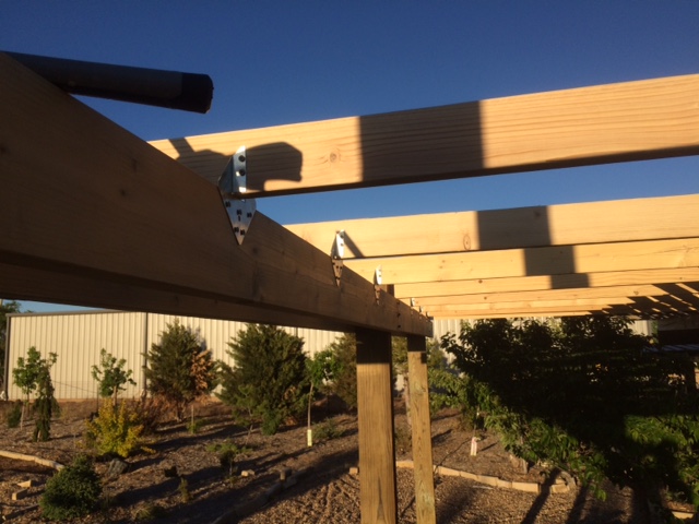 Wolny koniec desek 2x4" (przesel) przysrubowujemy do belki miedzy slupami takimi lacznikami. Unieruchamiaja one deske w miejscu i wiatr nie moze poderwac jej do gory.