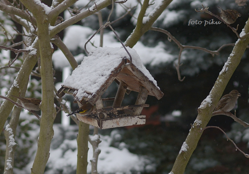 Na koty nie ma sposobu. Moje rzadko wychodzą, bo im się nie chce na śnieg, ale przychodzi kilka od sąsiadów i czasem siadają przy karmniku. Jak widzę to przeganiam. Ptaków jest dużo - mam wrażenie że niewiele musi być karmników w okolicy. Już zjadły 50 kg słonecznika, a kolejne 20 czeka. Jednak nie są to takie jednolite stada jak u Marty, z wyjątkiem sierpówki, która kilka razy w ciągu dnia urządza oblężenie. Reszta ptaków w ciągłym ruchu. Jak nic nie ma przy karmniku i cisza, to wyglądam krogulca - ostatnio zagląda częściej i zrobił sobie punkt widokowy na sośnie.