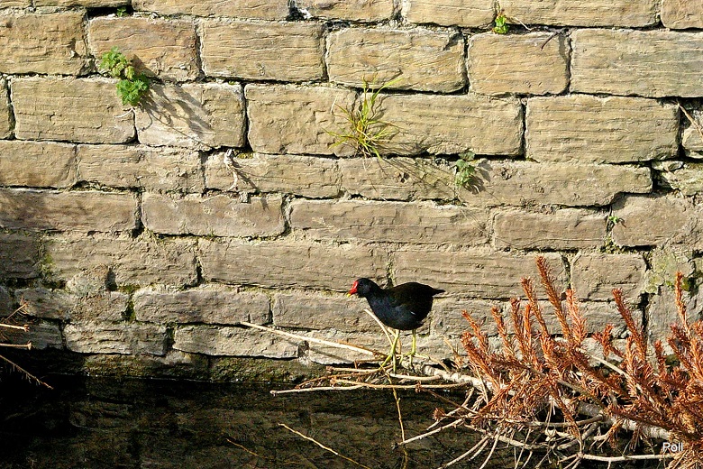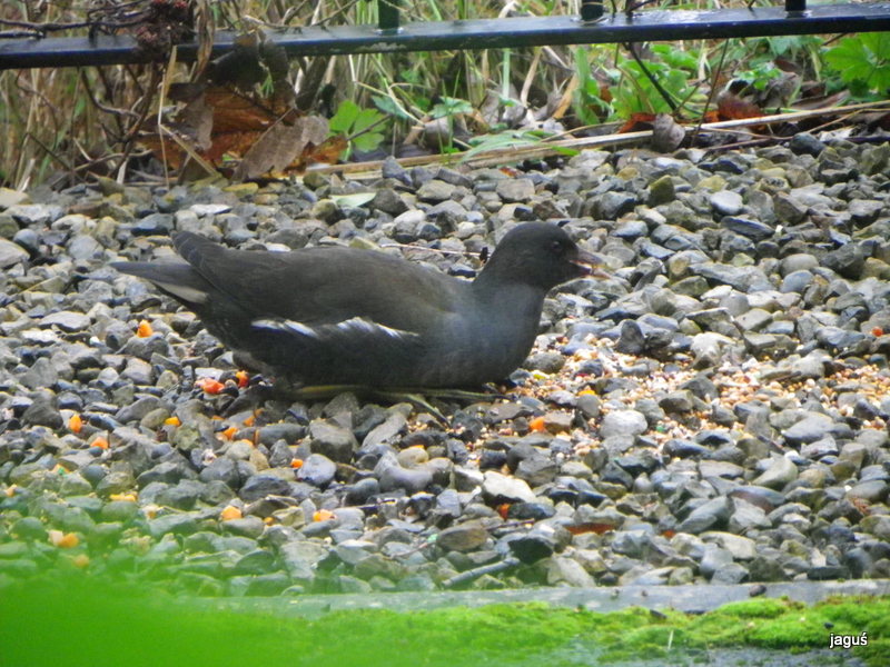 A tu młoda kurka wodna. Nie ma jeszcze pomarańczowego dzioba. Ubiegłoroczna zima była dość sroga jak na angielskie warunki więc przychodziła na ziarenka. Musze przyznać, że jadła w dość dziwnej pozycji.