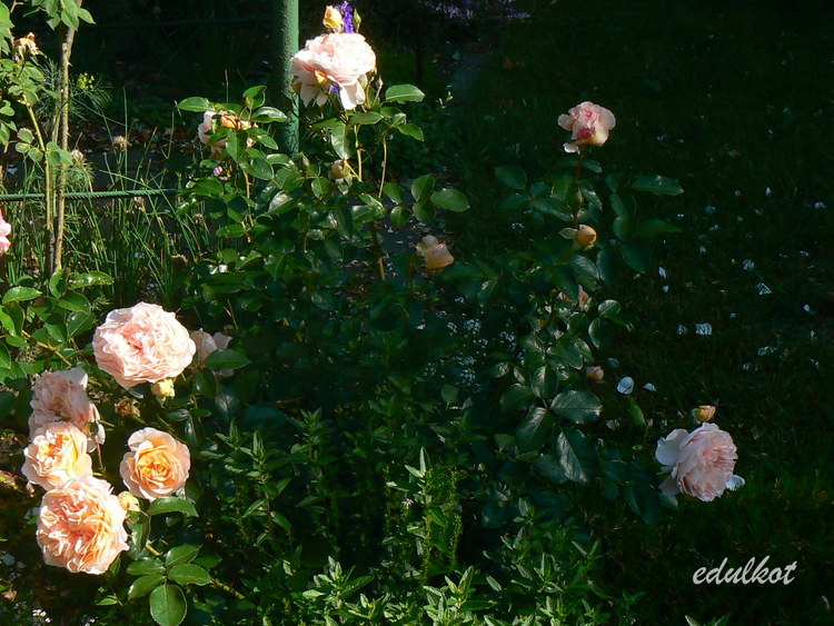 Kwiaty: średnie, pełne, pomarszczone, morelowe, starzeje się do jasno morelowego, kwitnie w gronach cały sezon.