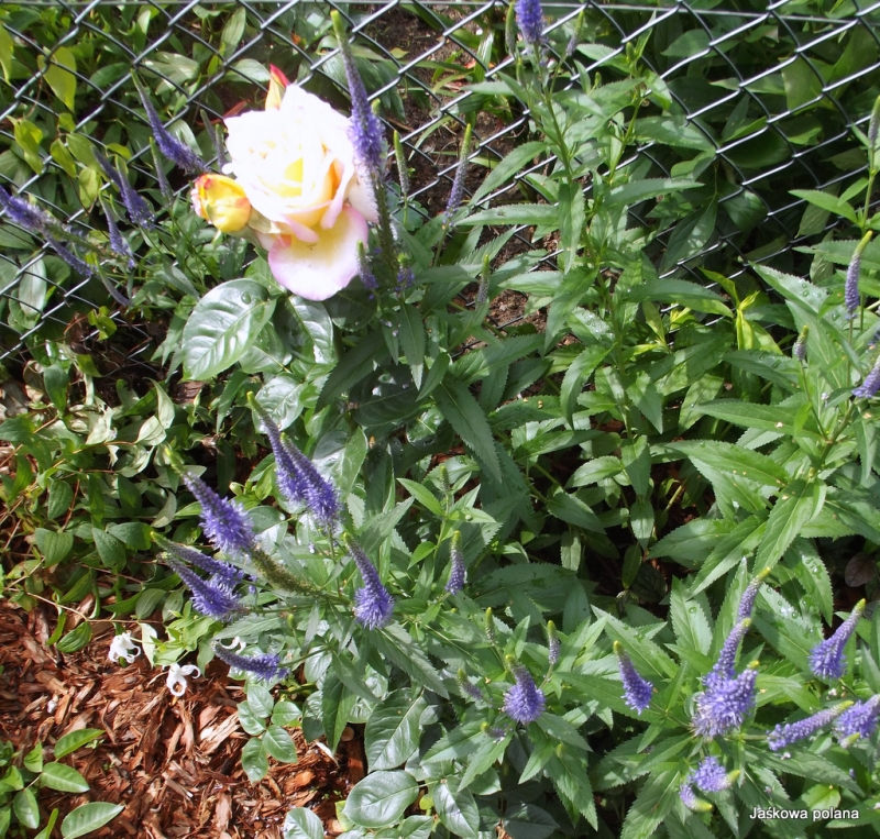 Nie dorosła metra wysokości(trzeci sezon). Pierwsze kwitnienie wiosną z większością wielkokwiatowych na sztywnych łodygach do pierwszego deszczu kiedy to pochyla główki.Powtarza słabiej ale większymi kwiatami i w innym troszkę kolorze. Matowe mniejsze listki, zimuje pod kopczykiem. Jesienią oskubana z liści bo łapie ja plamistość. Pachnie.