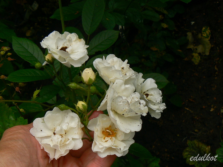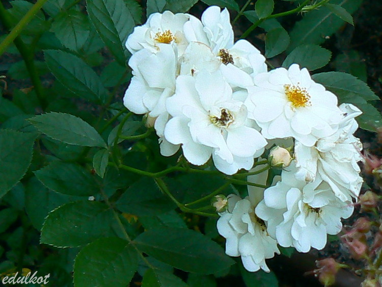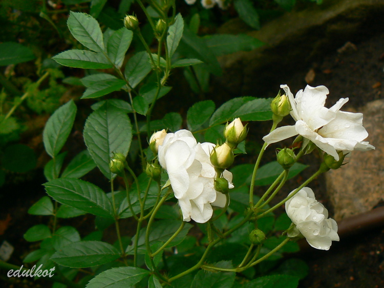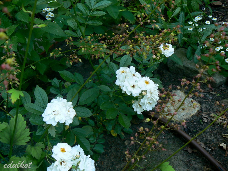 Hodowca: Dr. Gustav Brada, 1936, Typ: poliantha, Kwiaty: malutkie, półpełne, białe, kwitnie gronami chyba cały sezon, Wielkość: wys. do 2 m, cienkie pędy trzeba prowadzić jak pnącą Mrozoodporność: 6b,