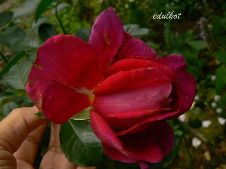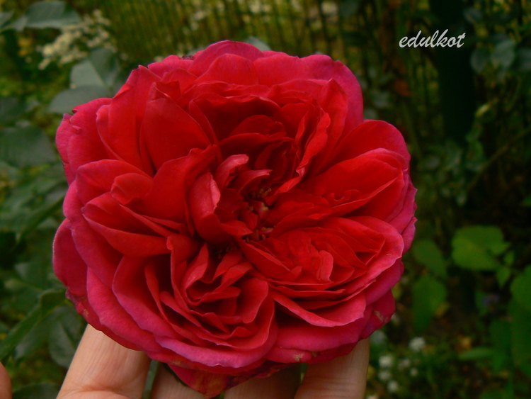 Kwiaty: duże, bardzo pełne w staromodnej formie, ciemno czerwone z fioletowymi cieniowaniami, powtarza kwitnienie.