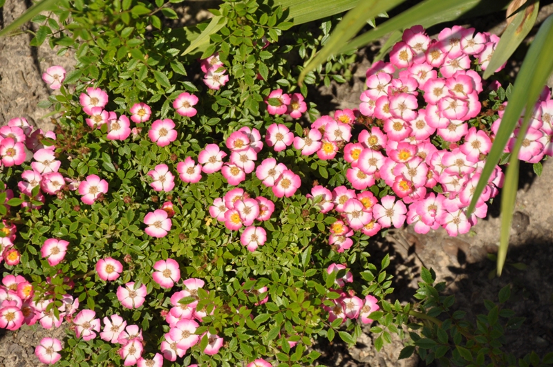 Kwitnie bardzo obficie, pokrywając się latem miniaturowymi, biało-różowymi kwiatami, zbudowanymi z 5 zaokrąglonych płatków otaczających żółte pręciki.