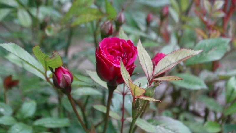 Kwiaty: pełne (18 płatków), 2–3 cm, kolor amarantowy (głęboki różowo-czerwony)