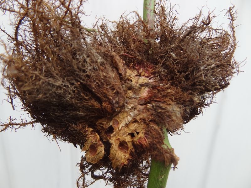 Larwy zimują w ziemi, by przeobrazić się w osobniki dorosłe, które składają jaja w młodych szczytach pędów.
