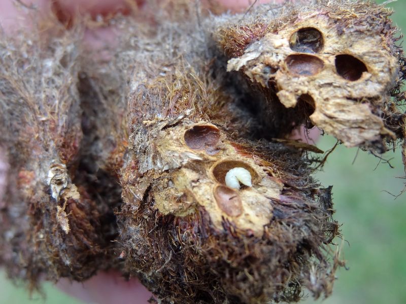 Tak tworzy się zdrewniała narośl na łodydze, włochata na końcach, z kilkoma białymi 3-milimetrowymi larwami wewnątrz.