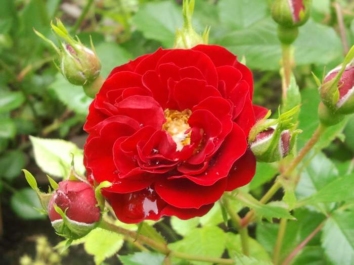 Drobne, krwistoczerwone kwiaty, lekko spłaszczone, wypełnione płatkami a jednocześnie ukazujące kontrastujący wianuszek żółtych pylników. Jasno zielone liście, zdrowe są dodatkową ozdobą.