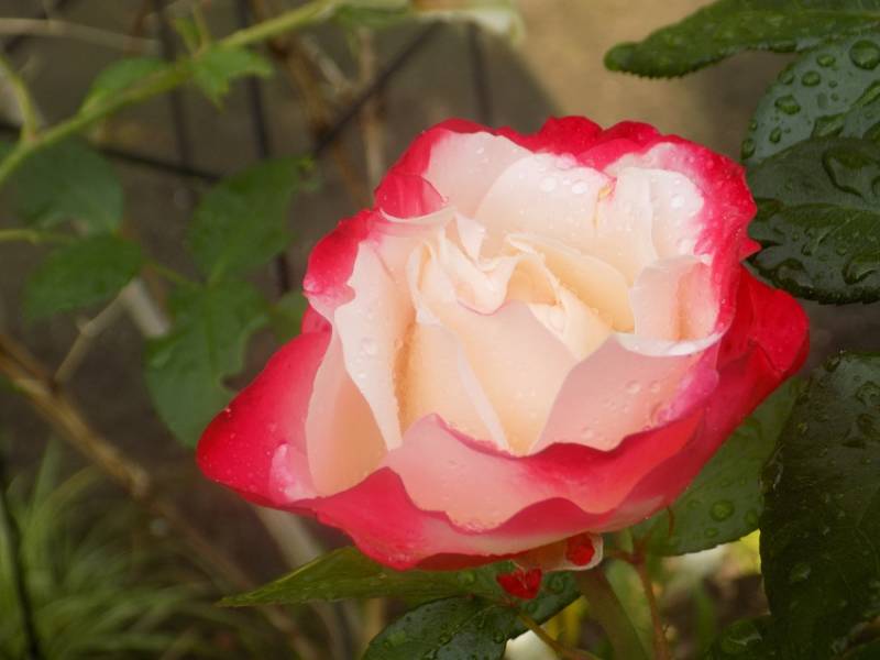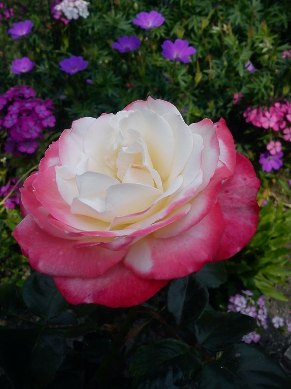 Kwiat wielkości ok. 10 cm w środku kremowo biały, na zewnątrz malinowo czerwony o pięknym klasycznym, bardzo mocnym zapachu. Kwitnie cały sezon, lecz po pierwszym kwitnieniu ma wyraźną przerwę.