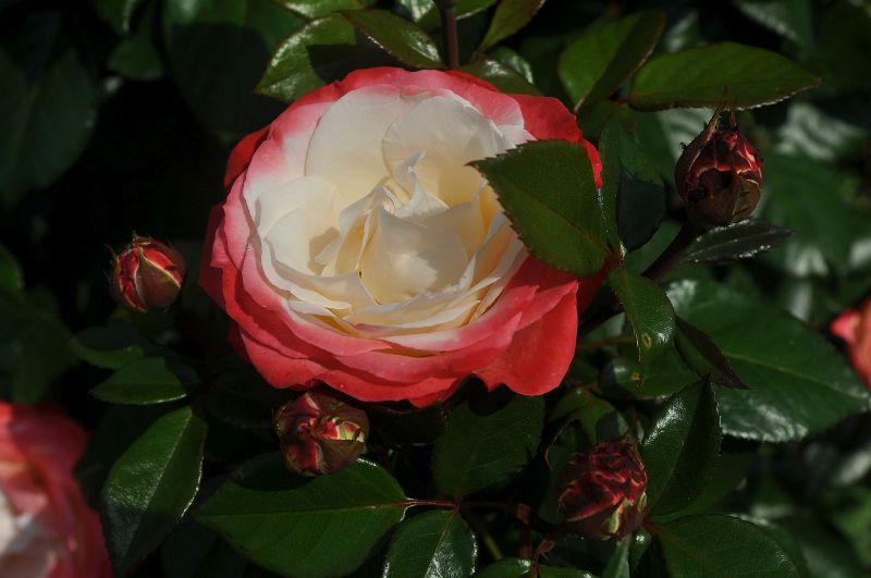Krzew dorasta do 120 cm, pokrój wyprostowany. Liście ciemno zielone pięknie podkreślają barwę kwiatów, młode pędy i listki czerwone.