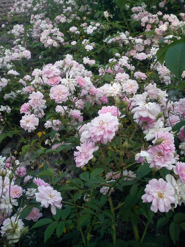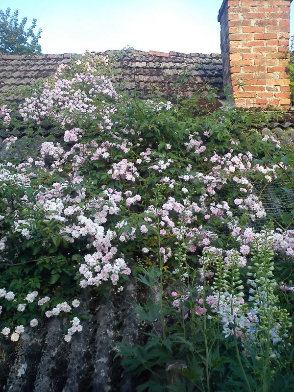 Pnąca, rambler. Raczej do prowadzenia przy drzewach, ponieważ wzrost ma niepohamowany, pędy cienkie, długie, wiotkie i kolczaste do przesady. Pięciometrowy roczny przyrost dla tej róży to bułka z masłem. Nie wyobrażam sobie upinania jej na podporze, chyba pod warunkiem, żeby wyznaczyć jej osobistego ogrodnika, dla którego byłaby jedynym obowiązkiem. Teoretycznie, kwitnie na dwuletnich pędach, w praktyce natomiast jest tak zaabsorbowana nieustającym wzrostem, że często zapomina o meritum. Jeśli już jej się zdarzy, wygląda zjawiskowo z pękami różowo- białych pełnych kwiatków, nawet jeśli "strong, musk fragrance" podawany przez Help Me Find okazuje się tylko takim sobie zapachem, wyczuwalnym zresztą dopiero po wetknięciu nosa między płatki...