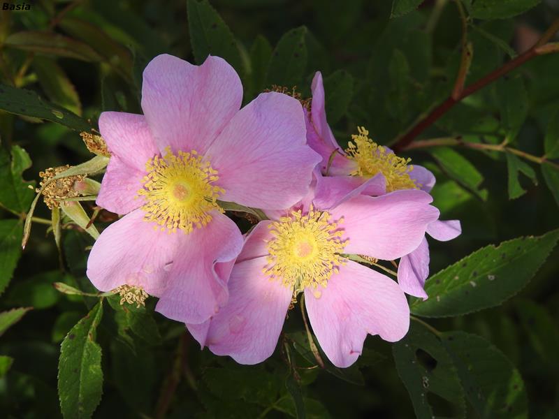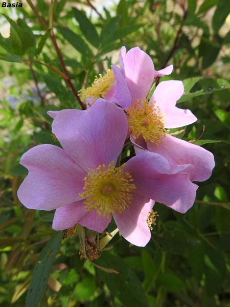 Kwiaty różowe, pojedyncze, pachnące. Pylniki żółte, dobrze widoczne, chętnie obsiadane przez pszczoły.