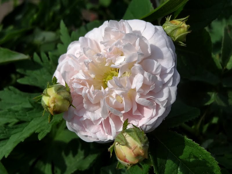 Kwiaty jasno różowe o średnicy ok. 7 cm. Bardzo pełne o budowie ćwierćrozetowej.